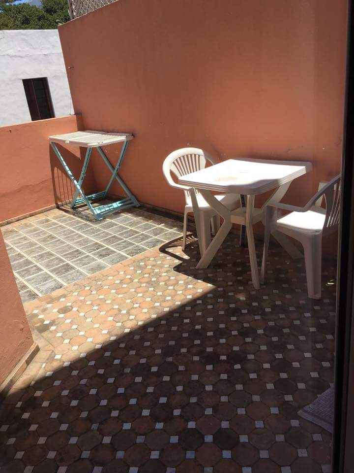 Location-d’un-beau-studio-loft-avec-terrasse-pas-cher-sur-Gauthier , au sixième étage composé d’un salon ouvert sur une cuisine attenante entièrement équipé, une chambre avec placards, salle de bain avec cabine douche, terrasse aménagée avec table et chaises.