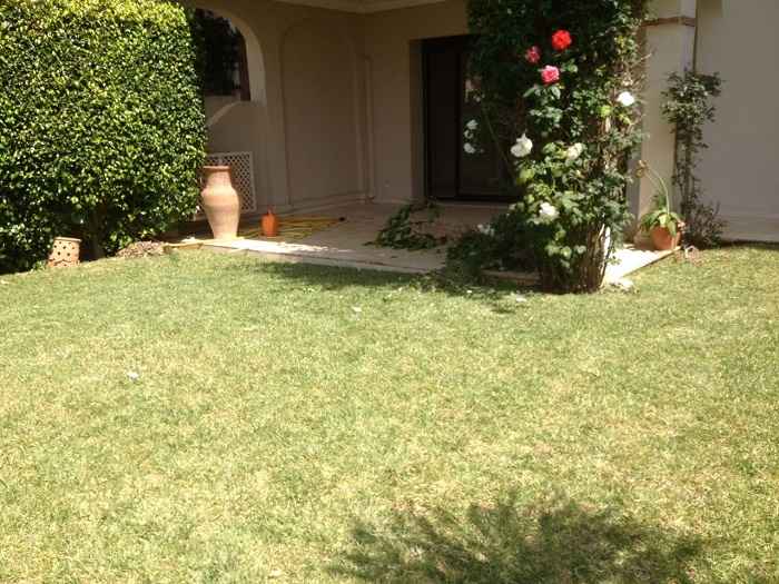 Location-magnifique-appartement-Ain Diab, d’une superficie de 200m² et 100m² de jardin privatif, se trouvant en rez-de-jardin avec une vue imprenable sur mer, résidence entourée de villas avec piscine collective, endroit très huppé, comprenant un hall avec double salon et coin cheminée donnant sur un beau jardin, un séjour, salle d’eau invités, cuisine équipée avec coin buanderie et chambre du personnel, deux chambres avec placards pour enfants et une terrasse, salle de bain avec cabine douche, une suite parentale dont placards et salle de bain avec baignoire, et deux places au parking, et un box