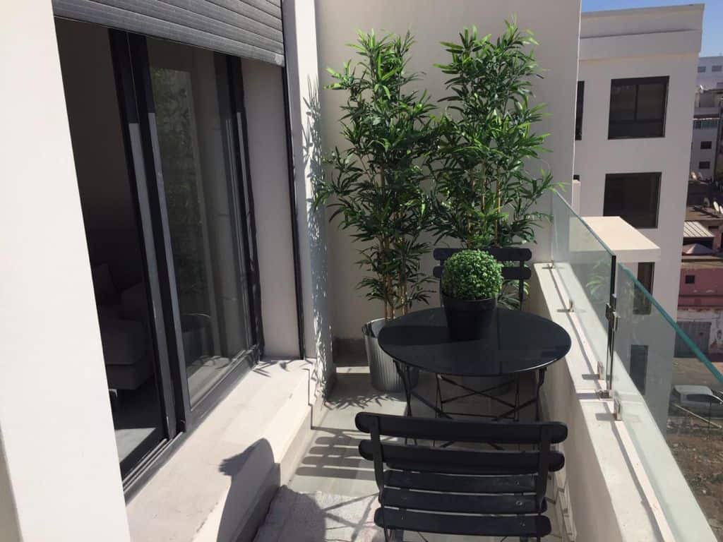 Location-studio-meublé-quartier-Les Princesses, ce studio meublé se trouve dans une résidence sécurisée proche de toutes commodités, comprenant un salon européen avec coin salle à manger donnant sur un balcon avec table et chaises, cuisine entièrement équipée attenante, chambre à coucher avec rangements, salle de bain avec cabine douche, et place au parking