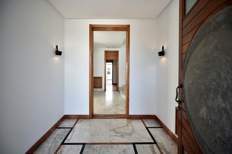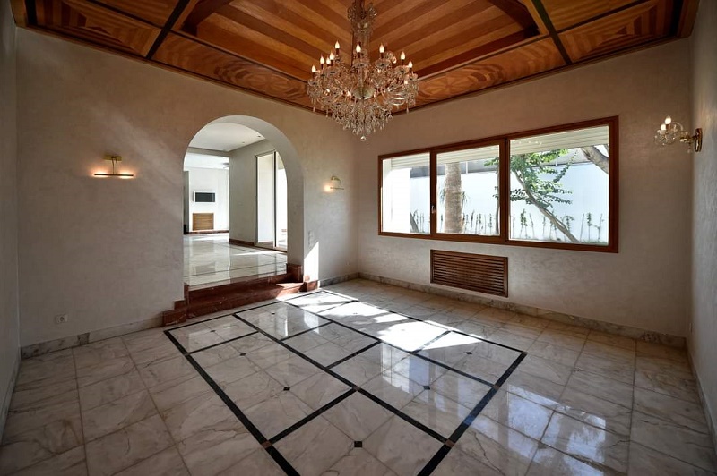 elle se compose de : Au rez-de-chaussée :- un beau et majestueux salon avec coin cheminée donnant sur un fabuleux jardin, un salon marocain très cosy, un séjour, toilettes réception, une Chambre à coucher avec rangements, une grande cuisine bien équipée avec ilot et à l’exterieur une chambre d’invités avec rangements et salle de bain avec cabine douche et une belle piscine avec protection pour enfants, chambre technique, chambre pour gardien