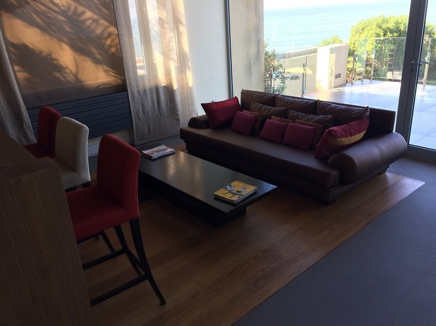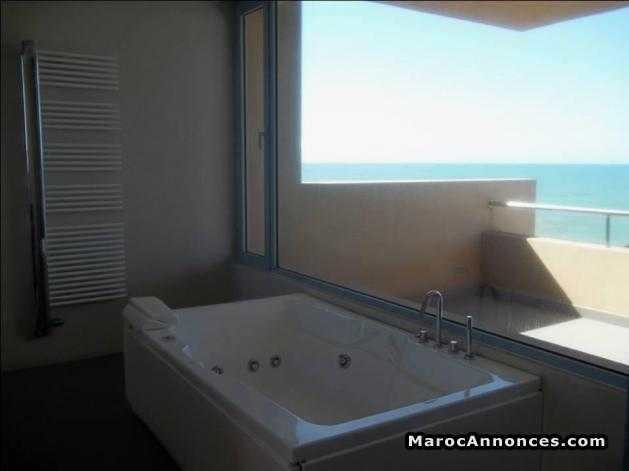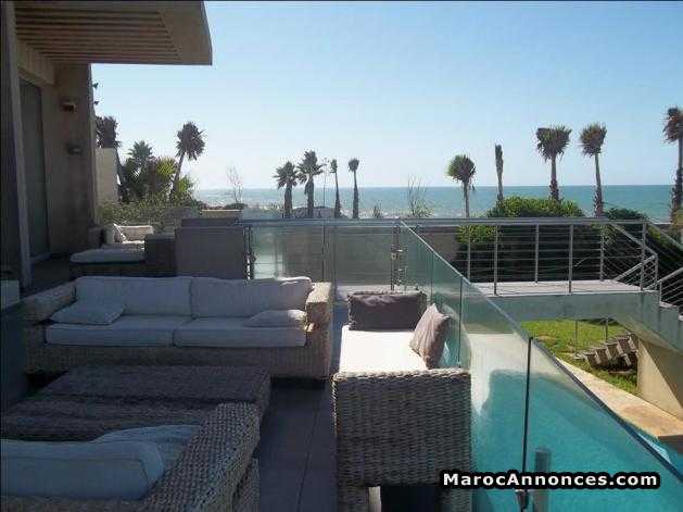 Location-Villa-Meublée-Bouznika villa de maître, meublée, pied dans l’eau, située pas loin de Bouznika Bay, d’une superficie de 700m², composée au rez-de-chaussée: un triple salon avec coin cheminée donnant sur grande piscine remplie avec l’eau de mer, un beau jardin arboré, un séjour, salle d’eau pour invités, cuisine moderne et entièrement équipée avec coin buanderie, parking.