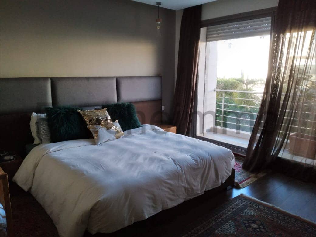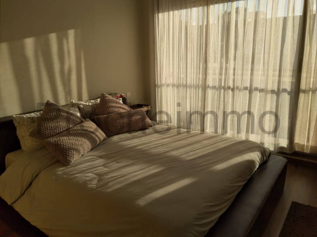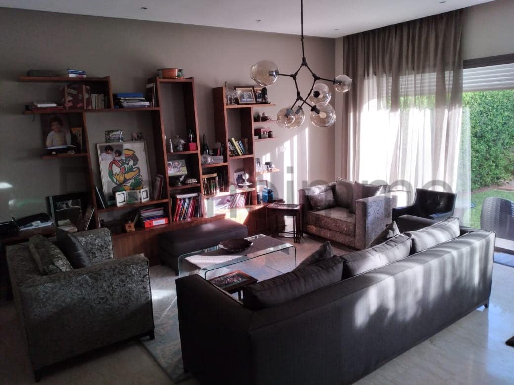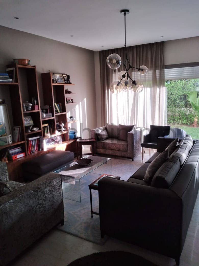 Location-Villa-Meublée-Piscine-sur Dar Bouazza, comprenant au rez de chaussé ;un double salon donnant sur une piscine et un beau jardin, séjour, salle d’eau invités, belle cuisine équipée, à l’étage: trois chambres, deux salles de bain avec douche, une suite parentale dont dressing et salle de bain avec baignoire , garage pour voitures, location longue durée
