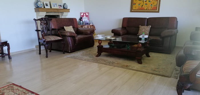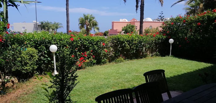 Maroc-immobilier-location-villa-Casablanca-Ain Diab avec une belle vue sur mer dans une residence sécurisé, c’est une villa en bande d’une superficie de 250m² terrain et 400m² construit sur trois niveaux comprenant au rdc : double salon avec coin cheminée donnant sur jardin avec vue sur mer, toilettes réception, un séjour , une cuisine fonctionnelle