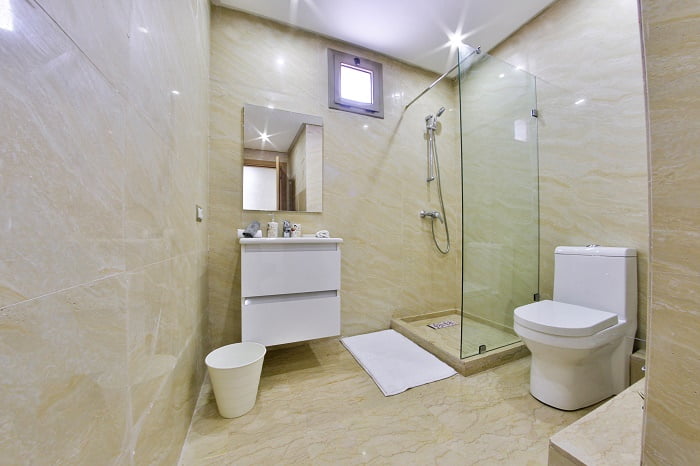 – Marbre au sol dans le salon, le hall et la cuisine type Crema Marfil