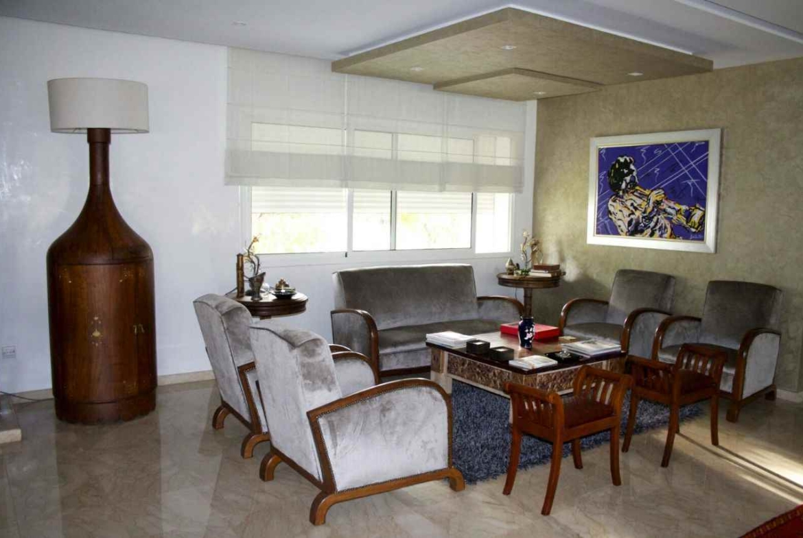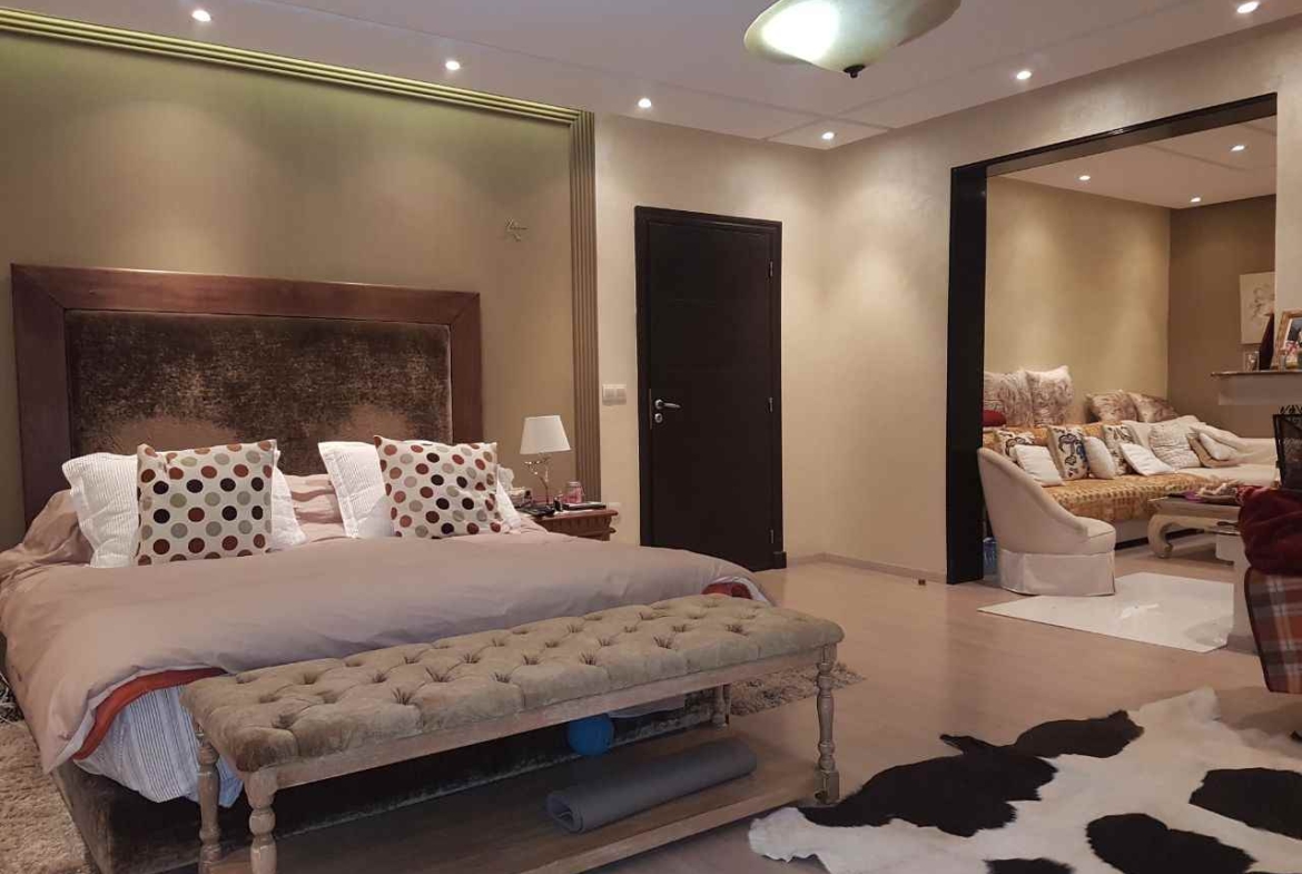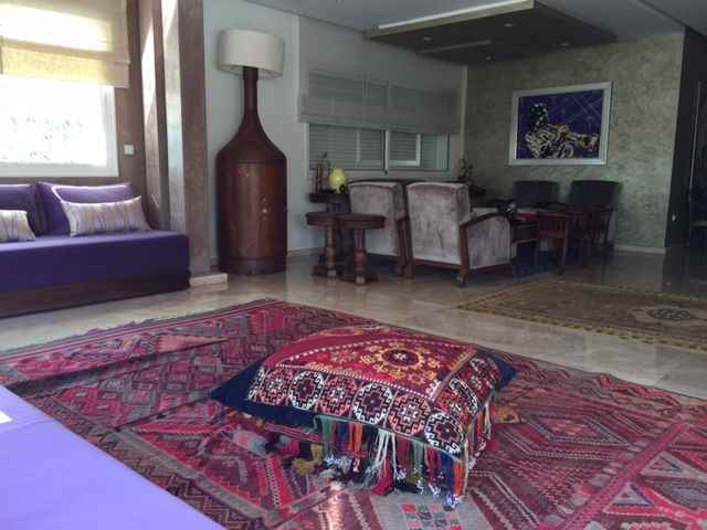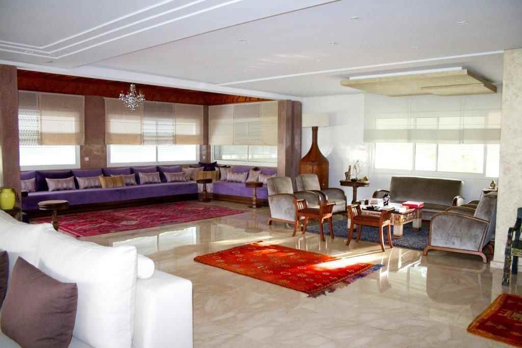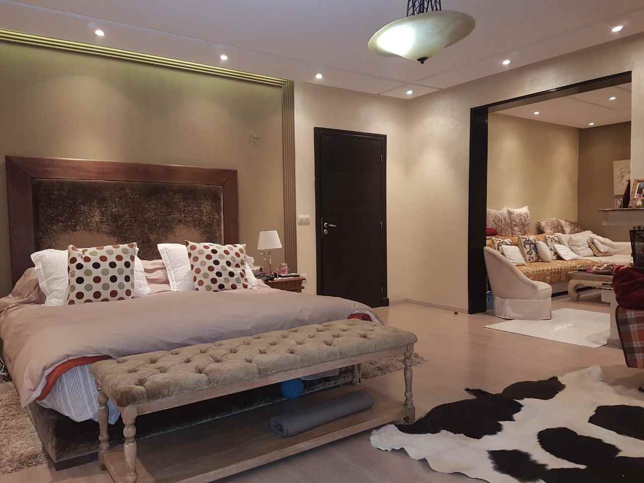 villa-de-maître-en-location-ou-vente-sur-bouskoura est doté d’un puits, raccordement a l’onep, chauffage central, toutes les chambres sont climatisés avec revêtement parquet et salons avec marbre perlatino au sol