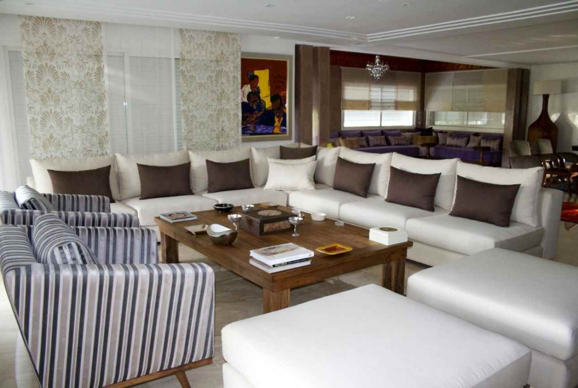 La villa est bien soignée et agréable à vivre avec de très belles prestations et de matériaux de haut standing avec une vue féerique de l’étage sur le golf de la cgi , cette propriété d’exception est construite sur deux niveaux se composant d’un RDC: avec une réception ultra moderne d’un triple salon avec coin cheminée donnant sur un beau jardin arboré et grande piscine de 219 m, toilettes invités, deux cuisines dont une grande et entièrement équipé et l’autre donnant sur une court, chambre de personnel avec ses sanitaires, une deuxième chambre, un séjour et une salle d’eau, garage pour voitures couvert